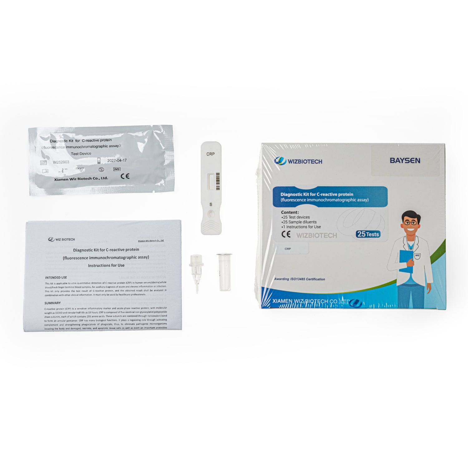 C-reaktives Protein (CRP) ist ein sensitiver Entzündungsmarker und ein Akutphasen-Reaktionsprotein mit einem Molekulargewicht von 115 KD und einer zirkulären Halbwertszeit von 19 Stunden. CRP besteht aus fünf identischen nicht glykosylierten Polypeptidketten-Untereinheiten, von denen jede 206 Aminosäuren enthält. Diese Untereinheiten sind durch nichtkovalente Bindungen zu einem ringförmigen Pentamer verbunden. CRP hat viele biologische Funktionen. Es spielt eine regulierende Rolle durch die Aktivierung des Komplementsystems und die Stärkung der Phagozytose der Phagozyten, um so in den Körper eindringende pathogene Mikroorganismen und beschädigte, nekrotische und apoptotische Gewebezellen zu eliminieren und eine wichtige Schutzfunktion während des Immunisierungsprozesses des Körpers auszuüben. Serum-CRP wird in der Leber synthetisiert. Die wichtigsten regulatorischen Faktoren für seine Synthese sind Interleukin 6, Interleukin 1b und Tumornekrosefaktor. Im normalen menschlichen Serum ist nur eine minimale Menge an CRP vorhanden. Im Allgemeinen liegt das CRP im Serum bei Neugeborenen unter 2 mg/l und bei Kindern und Erwachsenen unter 10 mg/l. Bei unspezifischen Reaktionen auf viele Krankheiten, insbesondere bakterielle Infektionen, Entzündungen oder Gewebeschäden, steigt das CRP innerhalb von 4 bis 6 Stunden stark an, erreicht nach 48 Stunden seinen Höchstwert, sinkt unmittelbar nach Rückgang der Krankheit wieder ab und kehrt dann auf den normalen Wert zurück. Bei Virusinfektionen kommt es jedoch zu keinem signifikanten Anstieg des CRP. Dies bietet eine Grundlage für die frühzeitige Erkennung von Infektionskrankheiten. Es ist auch ein Instrument zur Unterscheidung zwischen viralen und bakteriellen Infektionen. Somit hat C-reaktives Protein einen sehr breiten Anwendungswert bei Infektionskrankheiten, insbesondere für die Beurteilung von Entzündungen oder bakteriellen Infektionen.